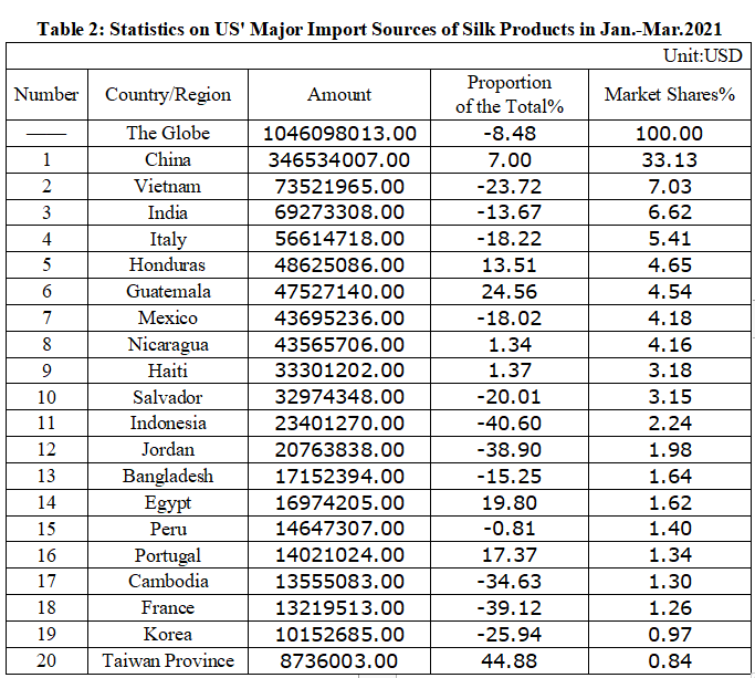 Table 2: Statistics on US' Major Import Sources of Silk Products in Jan.-Mar. 2021