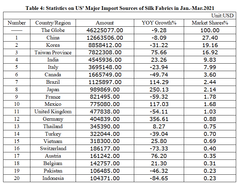 Table 4: Statistics on US' Major Import Sources of Silk Fabrics in Jan.-Mar. 2021