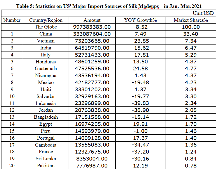 Table 5: Statistics on US' Major Import Sources of Silk Madeups in Jan.-Mar. 2021