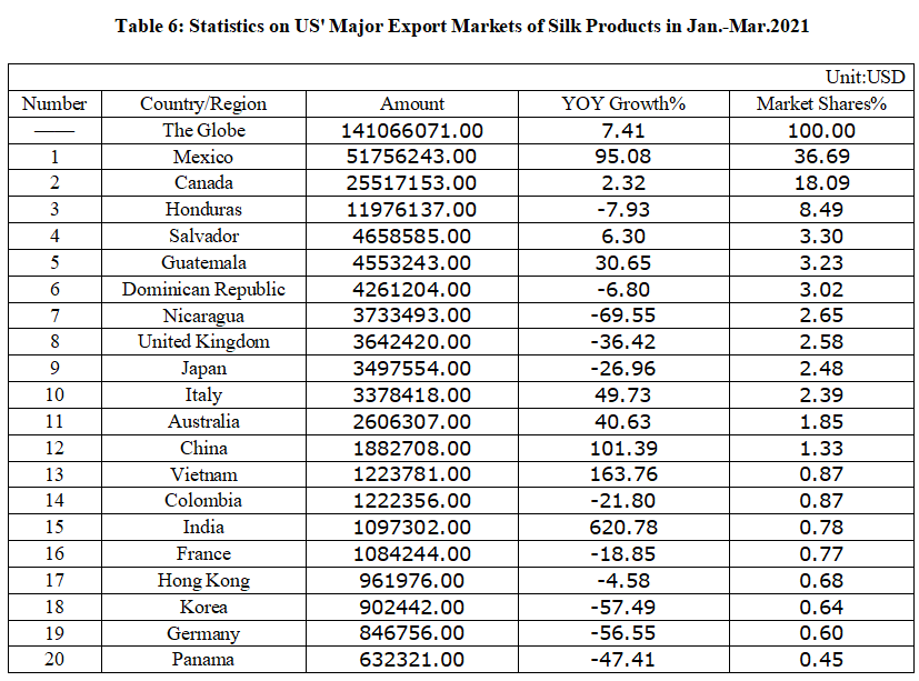 Table 6: Statistics on US' Major Export Markets of Silk Products in Jan.-Mar. 2021