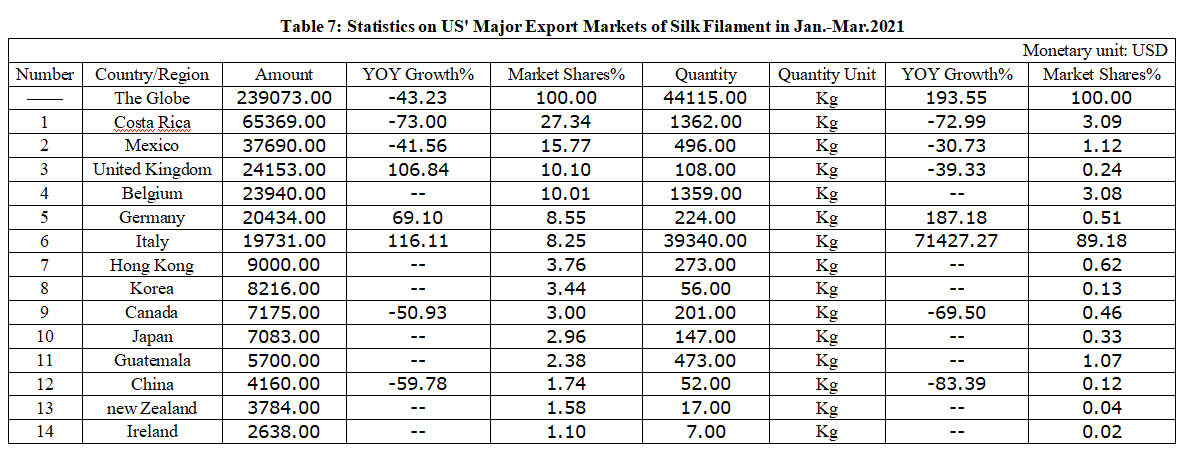 Table 7: Statistics on US' Major Export Markets of Silk Filament in Jan.-Mar. 2021