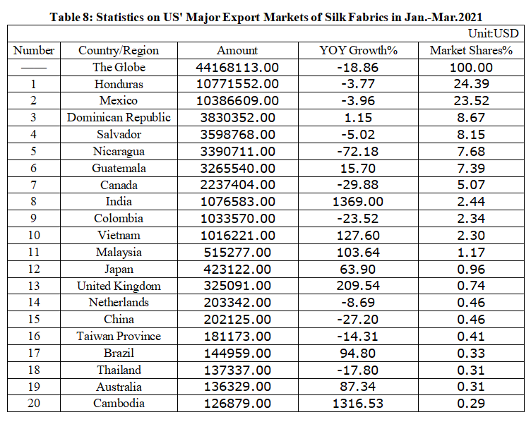 Table 8: Statistics on US' Major Export Markets of Silk Fabrics in Jan.-Mar. 2021