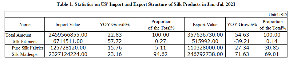 Table 1: Statistics on US' Import and Export Structure of Silk Products in Jan.-Jul. 2021