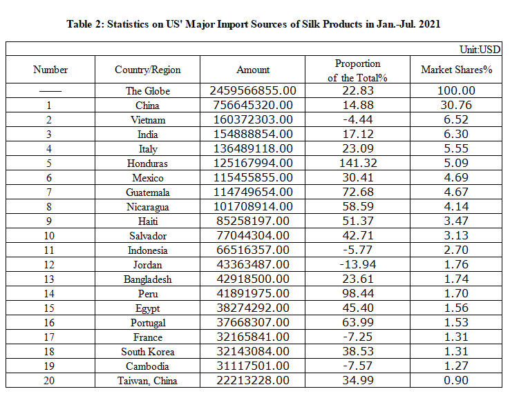 Table 2: Statistics on US' Major Import Sources of Silk Products in Jan.-Jul. 2021