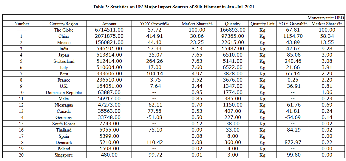 Table 3: Statistics on US' Major Import Sources of Silk Filament in Jan.-Jul. 2021