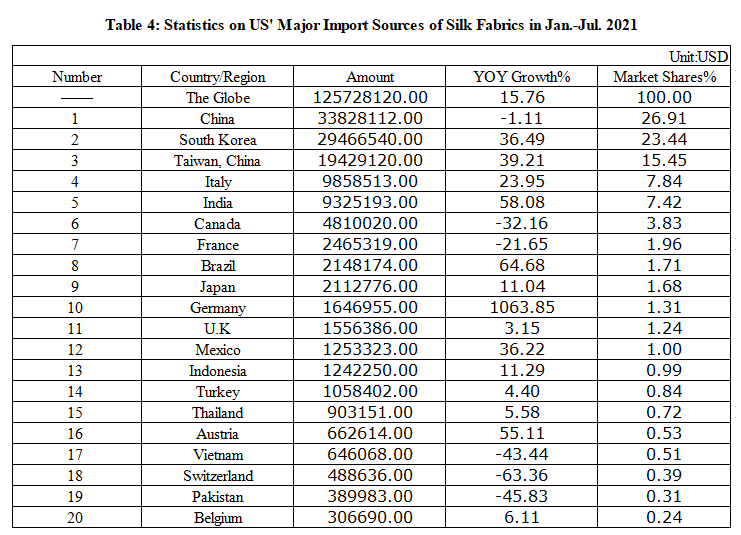 Table 4: Statistics on US' Major Import Sources of Silk Fabrics in Jan.-Jul. 2021