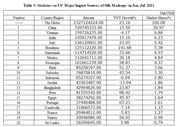 Table 5: Statistics on US' Major Import Sources of Silk Madeups in Jan.-Jul. 2021