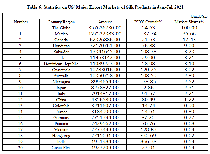 Table 6: Statistics on US' Major Export Markets of Silk Products in Jan.-Jul. 2021