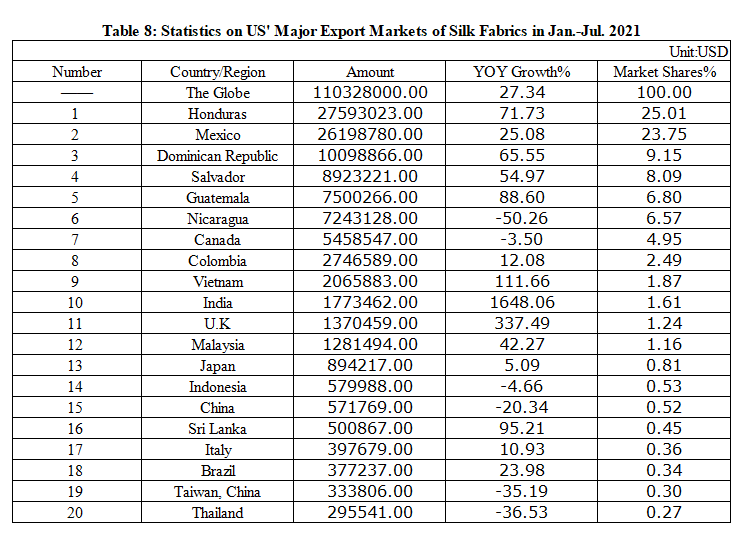 Table 8: Statistics on US' Major Export Markets of Silk Fabrics in Jan.-Jul. 2021