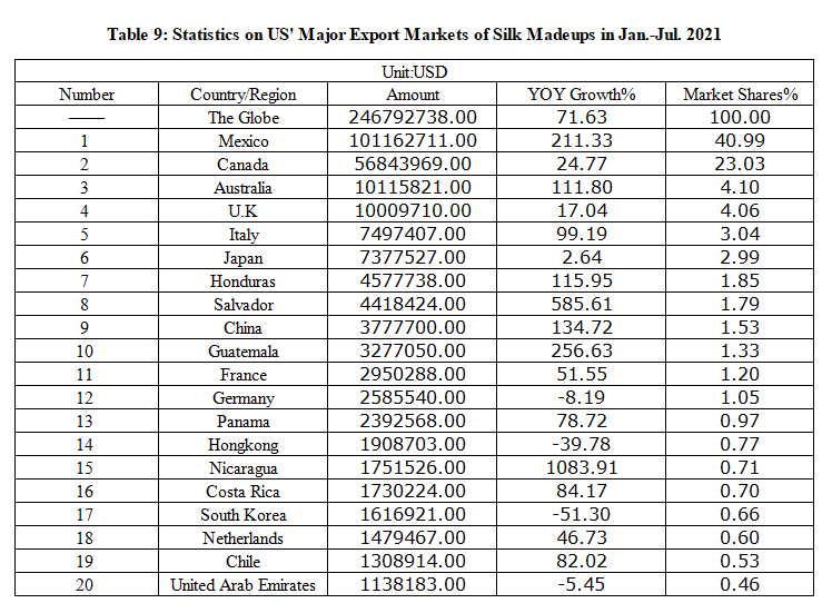 Table 9: Statistics on US' Major Export Markets of Silk Madeups in Jan.-Jul. 2021