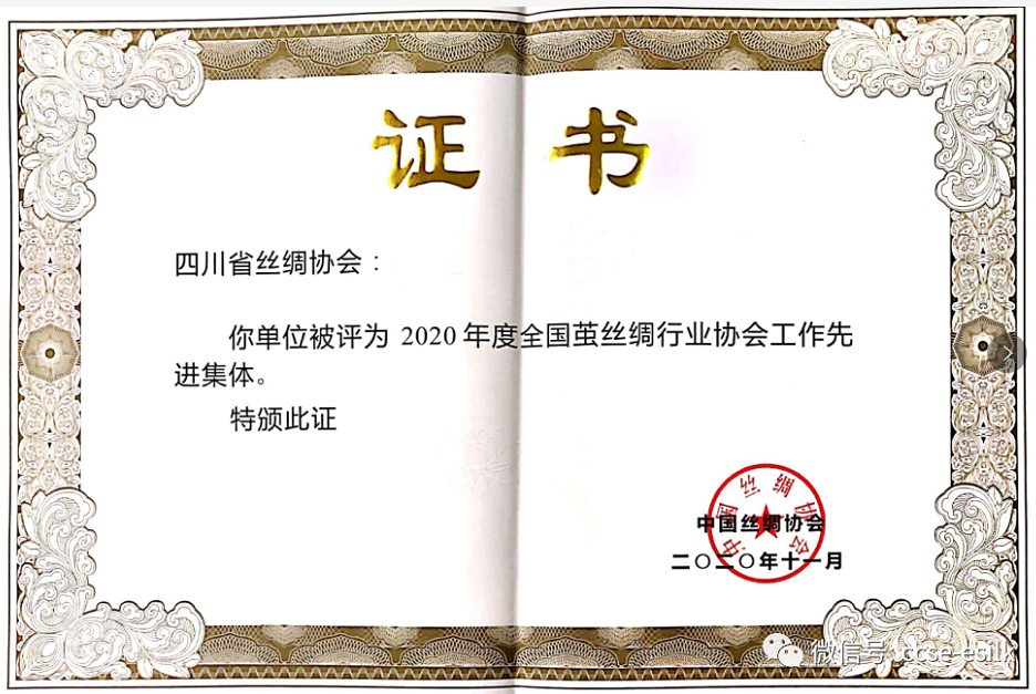 In the last three years, Sichuan Silk Association has been awarded many honors, such as the “Advanced Unit of Inspection and Statistics on Market Operation in 2018”, “Advanced Unit of Inspection and Statistics on Market Operation in 2019” by Sichuan Department of Commerce, “Advanced Collective of the National Silk Industry Association Work in 2019” and “Advanced Collective of the National Silk Industry Association Work in 2019” by China Silk Association.