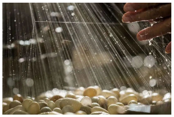 When the coooon is ready, it is treated with boiling water or hot air and the silk filaments are unwounded again, getting soft by the heat, which is called “reeling the filament”.