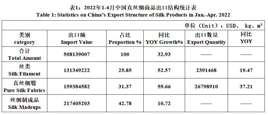 From January to April, the export value of silk filament was 131 million dollars, jumping 52.57%, accounting for 25.85%, and the quantity of which was 2391.47 tons, growing 19.47%, with its export unit price of 54.92 dollars per kilo, up 27.67%; silk fabrics amounted to 159 million dollars, growing 59.66%, accounting for 31.37%, with its export unit price of 5.95 dollars per meter, growing 16.44%; the exports of silk madeups totaled 217 million dollars, growing 10.72%, accounting for 42.78%.