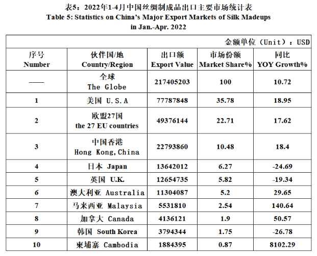 From January to April, the export of silk products to Japan, Britain and South Korea declined, and other major markets increased by different margins, among which Cambodia grew greatly, becoming the tenth major market of silk exports. The market share of the United States, the European Union and Hong Kong had increased slightly, no more than 3%, and Japan's share had declined by 3%.