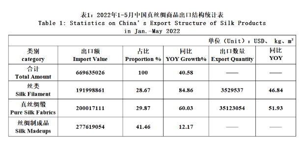 The export value of pure silk products was 670 million US dollars , a year-on-year increase of 40.58%, accounting for 0.54% of China's textile and apparel exports. During the same period, the export value of textile and apparel increased by 16%.