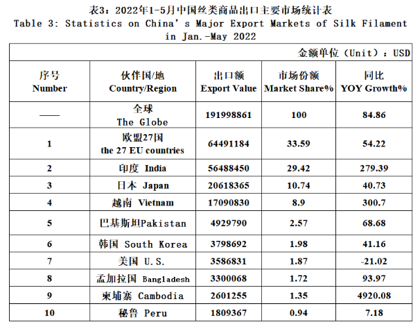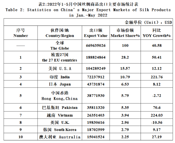 Among the top ten major markets for silk filament exports, in addition to the negative growth of exports to the United States, others had different degrees of growth, of which India, Vietnam, Bangladesh and Cambodia increased more than the overall growth rate of silk exports. India’s market share increased by 15%, while the share of the European Union and Japan fell by 7% and 3% respectively.