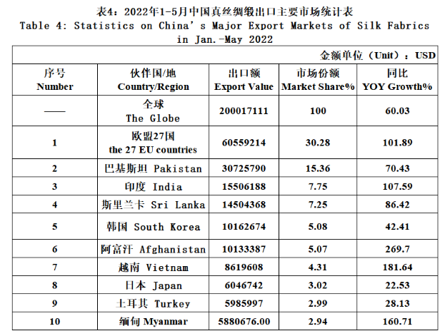 Silk fabrics increased to varying degrees in the top ten export markets, doubling to the European Union and Indian markets, and soaring greatly to Afghanistan, Vietnam and Myanmar. Compared with the same period last year, the EU’s market share increased by 6%, Pakistan’s fell slightly, and India’s and Sri Lanka’s share increased by 1-2%.