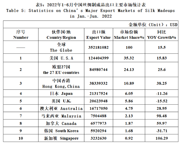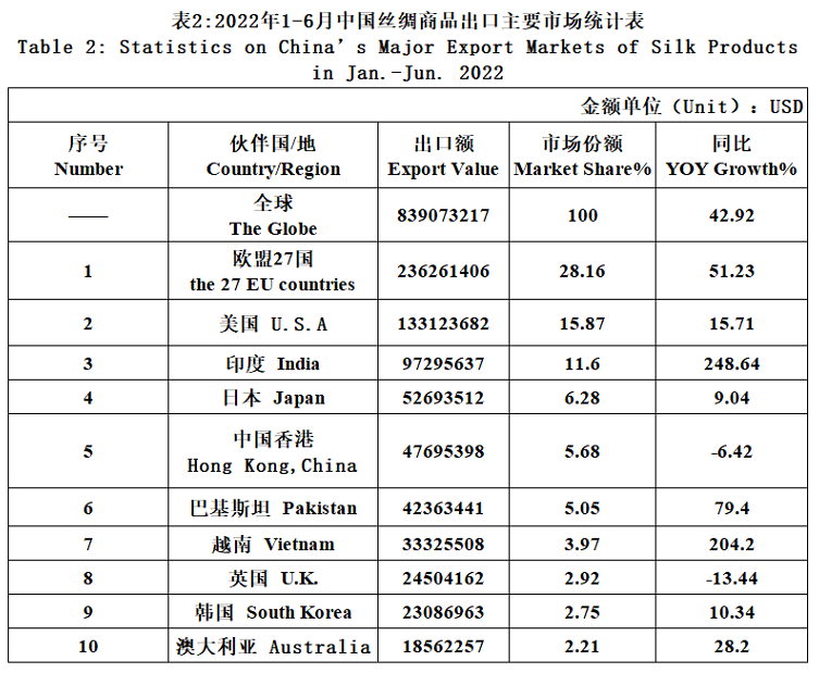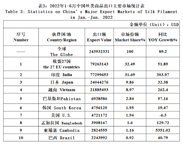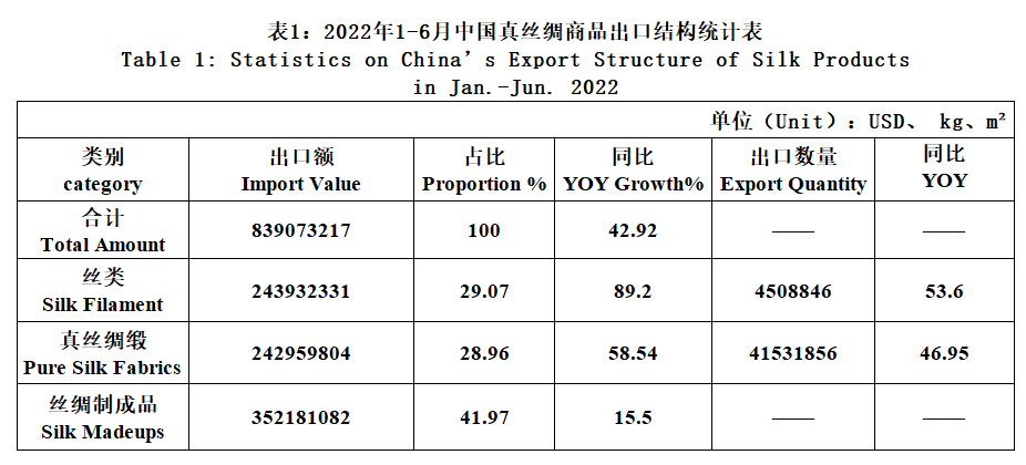 The exports of the three categories had risen in different degrees in the first half of 2022. Among the three categories, the export growth of silk filament and silk fabrics expanded over 50%, that is mainly due to last year’s low base and the export value in the first six months of this year had not yet reached the level of the same period in 2019, but the gap was narrowed to nearly 30 million dollars.
