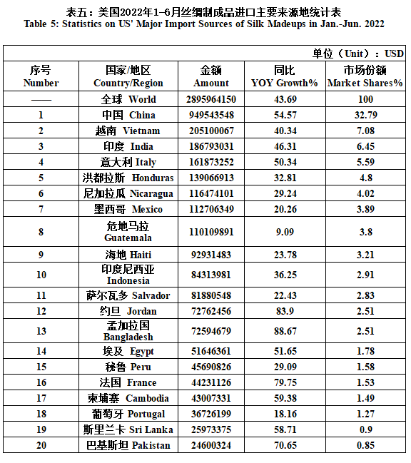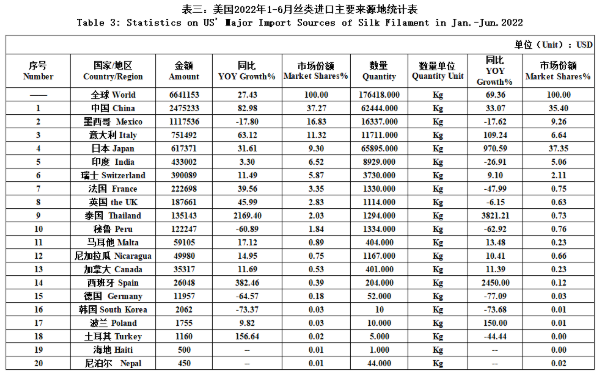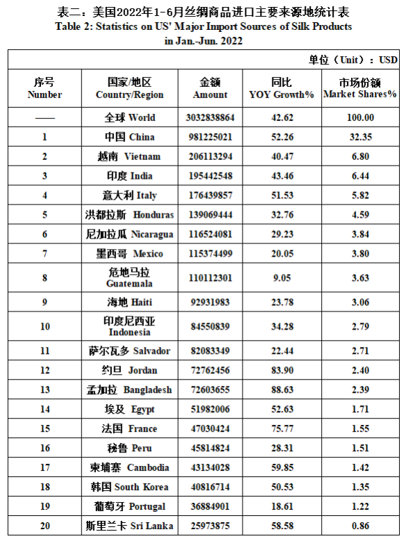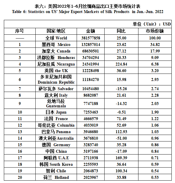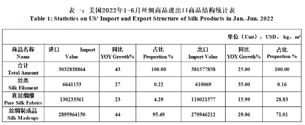 From January to June, the US’ silk trade value totaled 3414 million US dollars, a year-on-year increase of 40.41%. Among them, the import value was 3033 million US dollars, up 42.62% YOY; the export value was 382 million US dollars, up 25% YOY(the same below). Details were as follows: