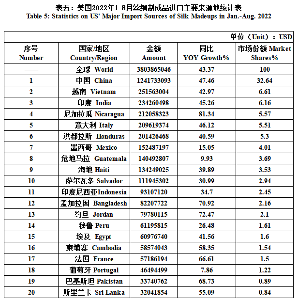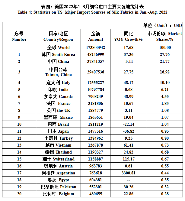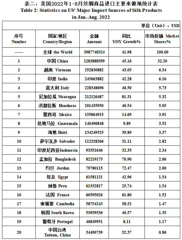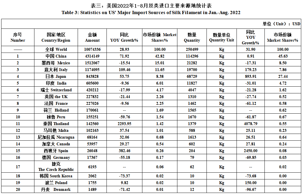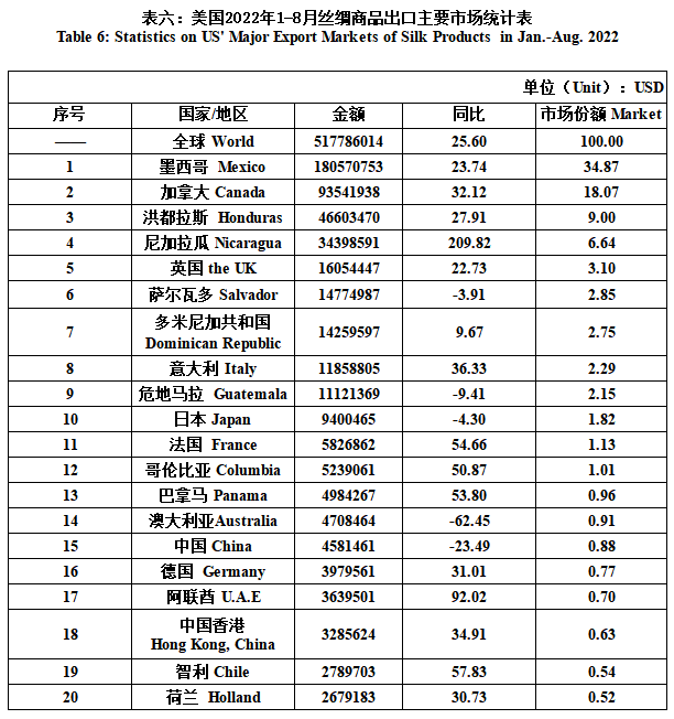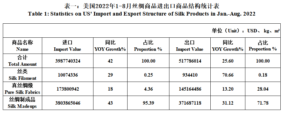 US’ Silk Product Imports & Exports in Jan.-Aug. 2022