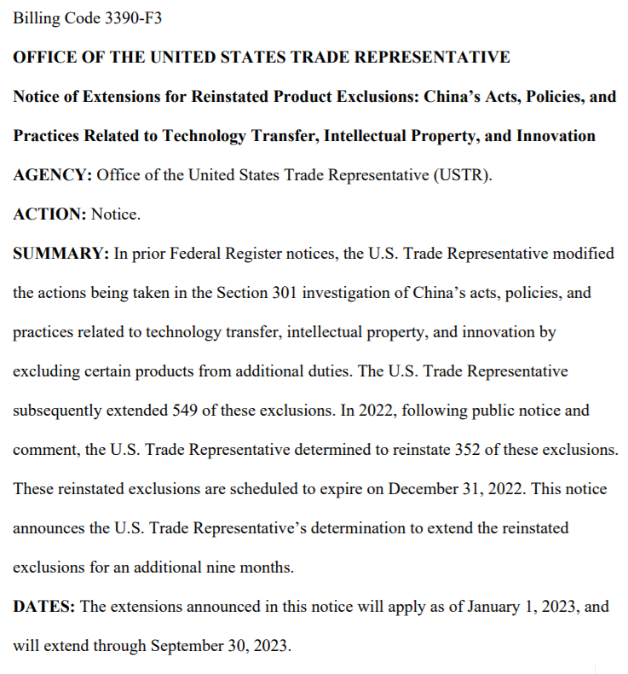 WASHINGTON – The Office of the United States Trade Representative today announced a nine?month extension of 352 product exclusions in the China Section 301 Investigation that had been scheduled to expire at the end of 2022. These exclusions were initially reinstated on March 28, 2022 and the extension will help align further consideration of these exclusions with the ongoing comprehensive four-year review.