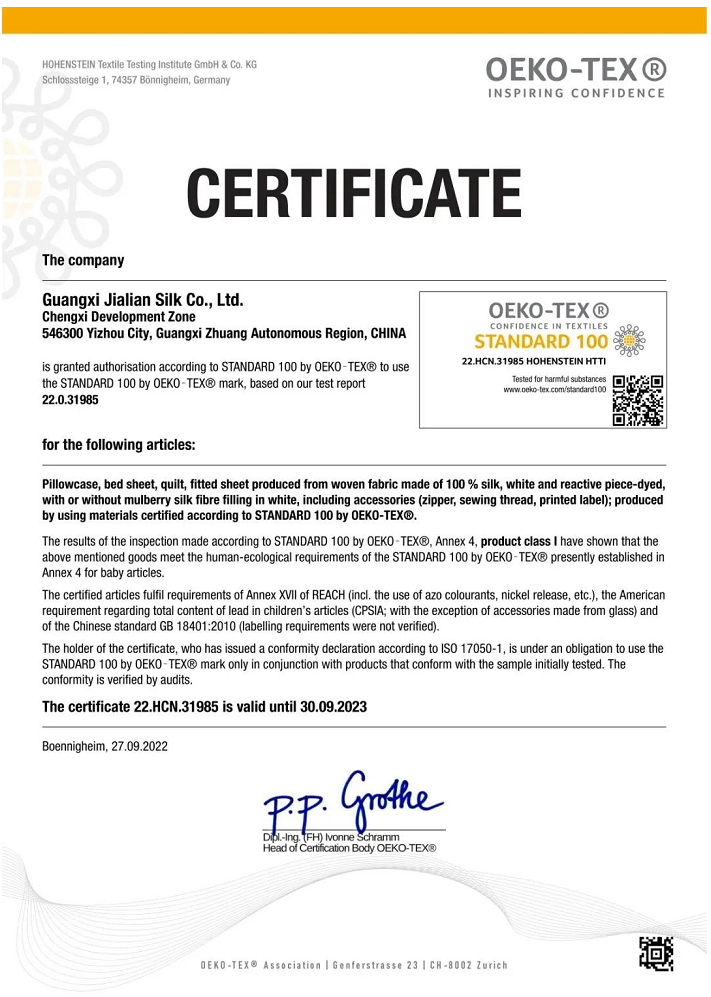 Congratulations to Guangxi Jialian Silk Co. Ltd. for its “South Silk”home textile products successfully being certified “STANDARD 100 by OEKO-TEX”in October 2022, and moreover meeting the strictest criteria of STANDARD 100 -Class I marking products for infants and children under 3 years of age. The German Hohenstein Institute has checked more than 300 kinds of harmful substances in the certification, fully verifying the products’ high quality and safety.