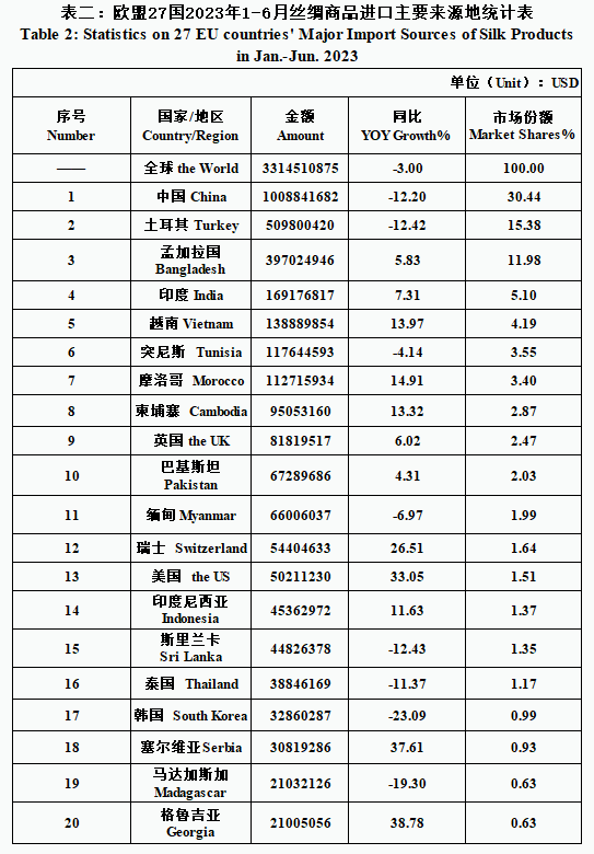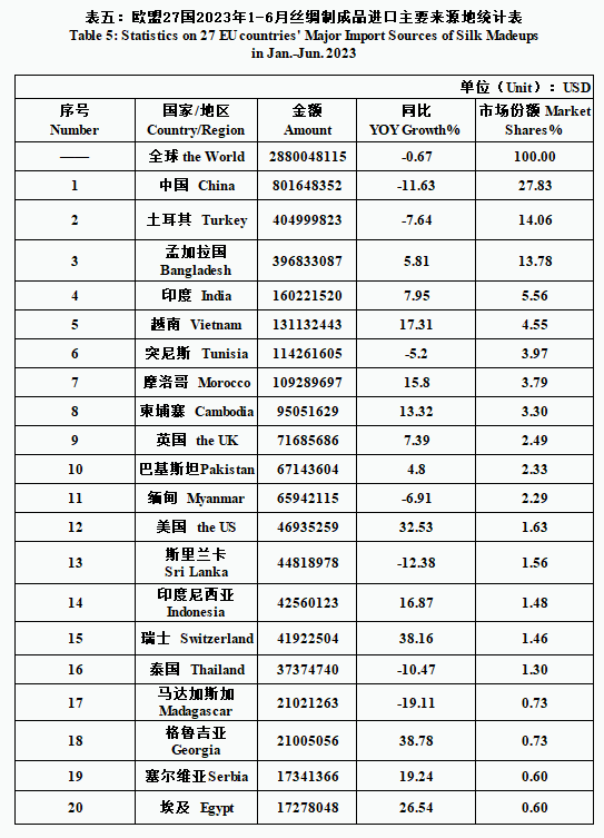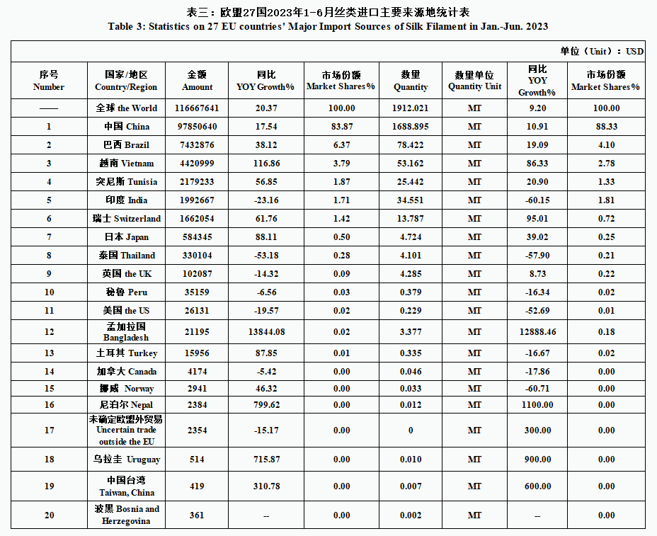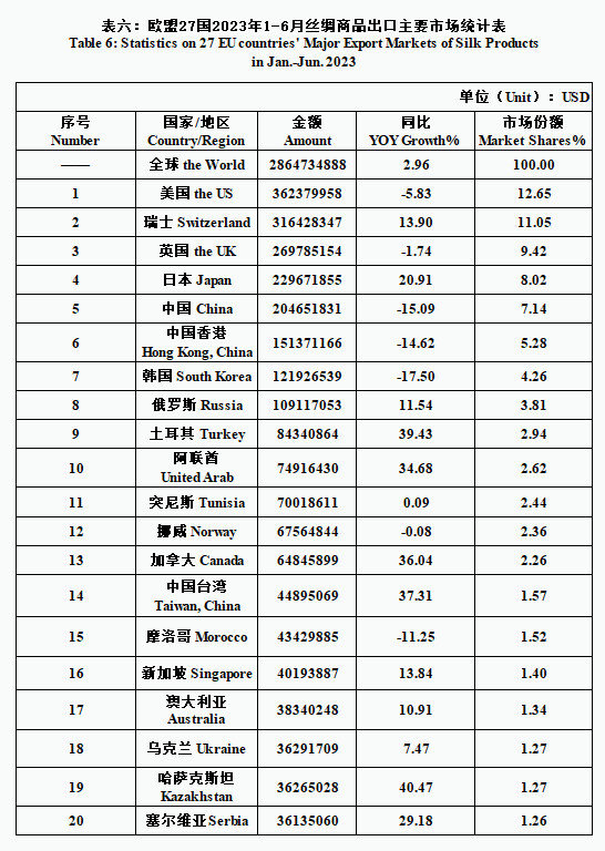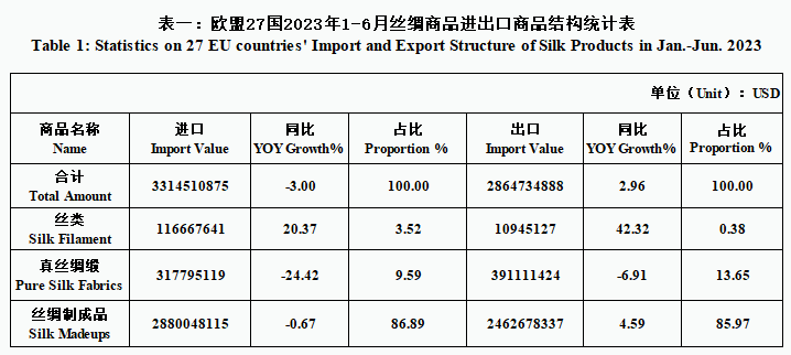 EU| 27 EU Countries’ Silk Product Imports & Exports in Jan.-Jun. 2023