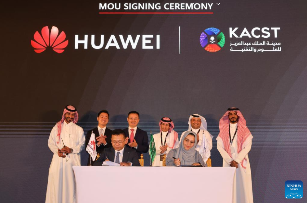 Representatives from Huawei and a Saudi company sign MoUs during the Huawei Cloud Summit Saudi Arabia 2023 in Riyadh, Saudi Arabia, on Sept. 4, 2023. The Chinese tech giant Huawei announced on Monday the opening of a cloud data center in Riyadh, as part of its efforts to expand its online service offerings in the Middle East.