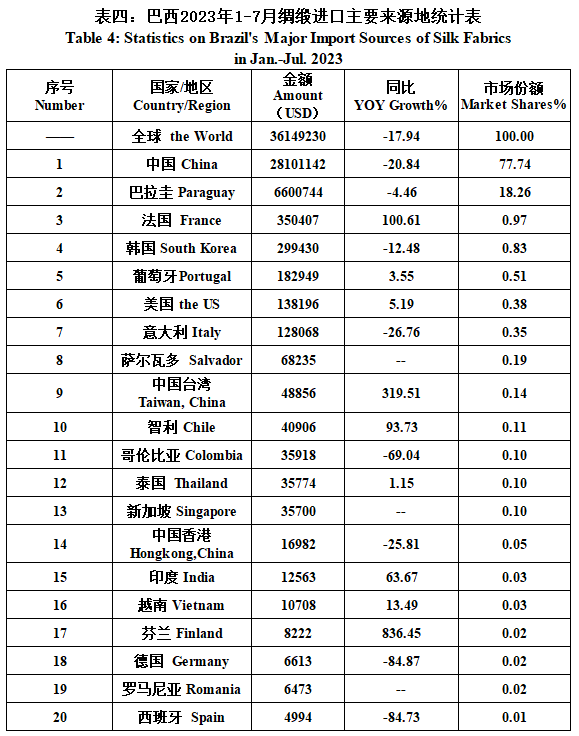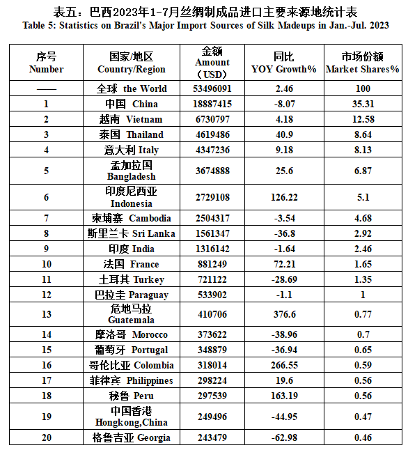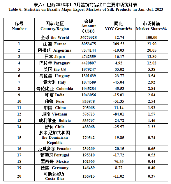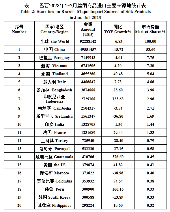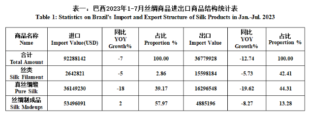 Brazil| Brazil’s Silk Products Import and Export Situation in Jan.-Jul. 2023(tables)