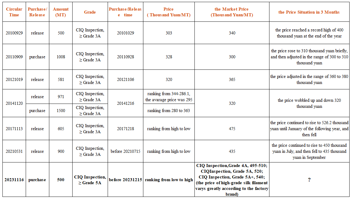 The requirements of the national reserve raw silk are as follows: dried-cocoon-reeled-silk (white) produced after August 2023; Grade 5A and above, 20/22D; meet the standard metric requirements and qualified by CIQ inspection.It is decided to set 83 bids, each of which is an independent bidding unit with 10 batches (about 6 tons). The maximum number of bids per enterprise is 5 targets (50 batches, about 30 tons).