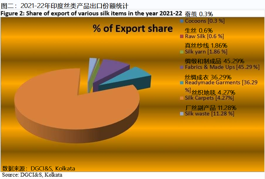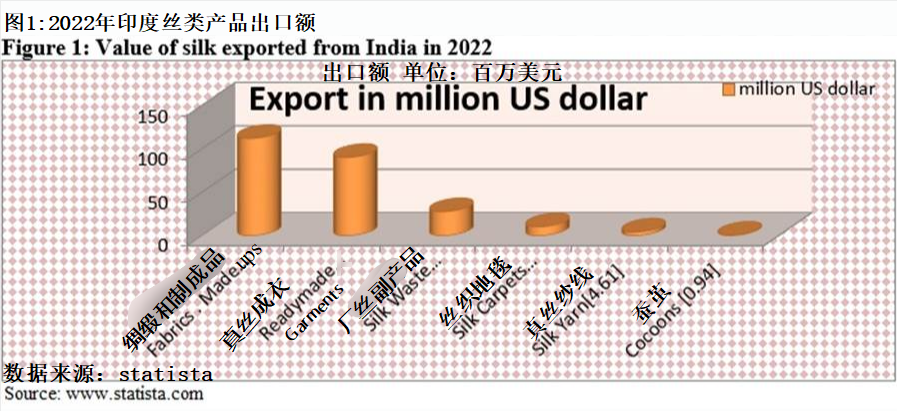 Figure 1 explains the value of exports from India in the year 2022. Fabric& made-ups and readymade garments had the largest share with export value of $112.41 million and $90.42 million respectively in the year 2022. Silk waste and silk carpets had export value of $28.02 million and $10.63 million respectively. Silk yarn and silk cocoons were the other two silk items exported in the year 2022.
