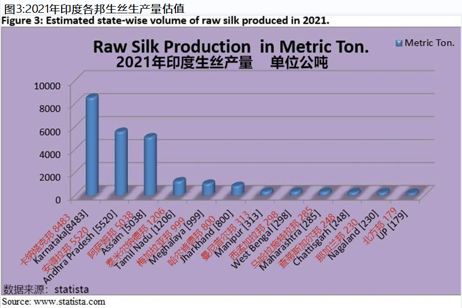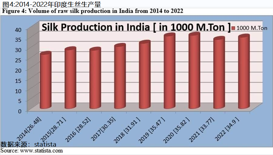 As per Figure 4, the total quantity of raw silk production increased from 26,480 mt in 2014 to 34,900 mt in 2022. Maximum raw silk production of 35,820 mt was registered in 2020. This is a good sign for the Indian silk industry, as rising trend of raw silk cultivation enhanced the prospects of raw silk production and employability of people in this country.