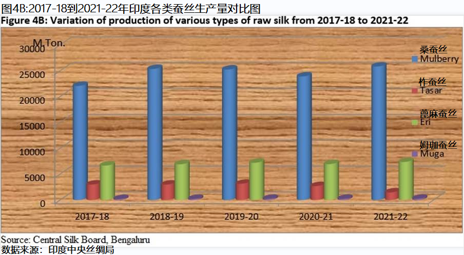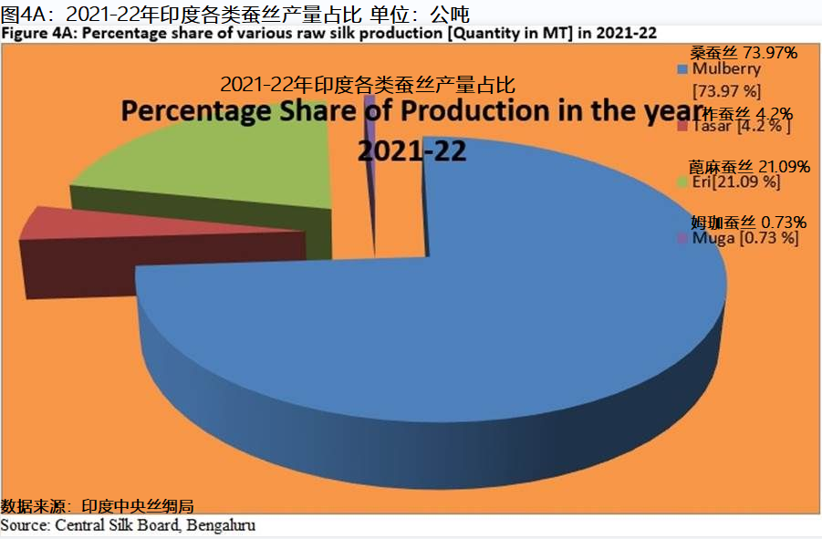 Figure 4A explains that 4 types of raw silk were produced in this country in 2021-22. Mulberry was the major silk produced with 73.97 per cent of the total silk production. Eri was the second largest type of raw silk at 21.09 per cent. Tasar and muga had a share of 4.2 per cent and 0.73 per cent respectively.