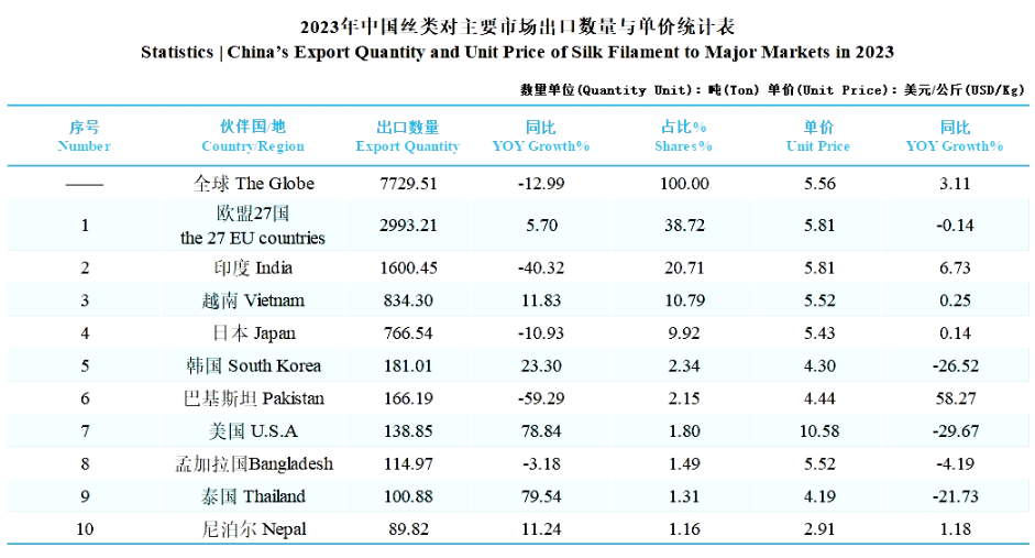 China's Export Statistics of Silk Filament to Major Markets in 2023