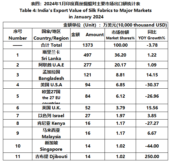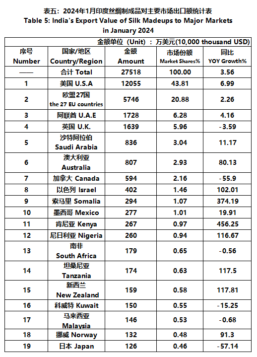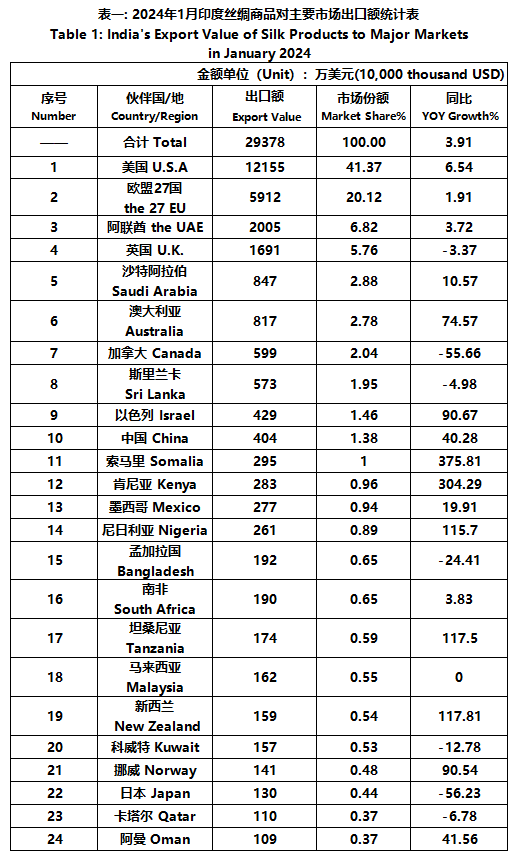 According to statistics from the Ministry of Commerce and Industry of India, in January, the foreign trade value of Indian silk products was 331 million US dollars, a year-on-year increase of 1.69%. Among them, the export value was 294 million US dollars, a year-on-year increase of 3.91%; The import value was 37.51 million US dollars, a year-on-year decrease of 12.89%.