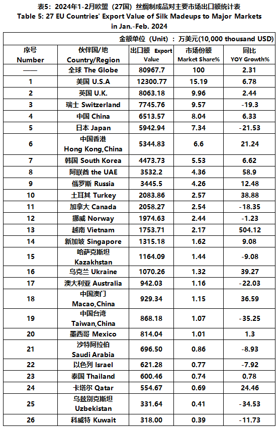 EU | 27 EU Countries' Silk Foreign Trade in Jan.-Feb. 2024(1)