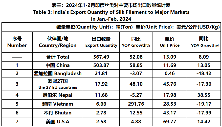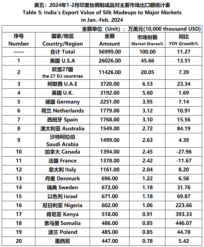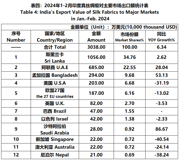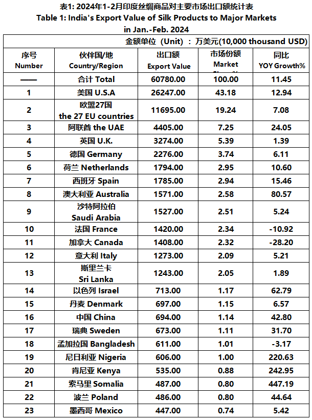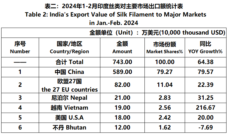 According to statistics from the Ministry of Commerce and Industry of India, from January to February, the foreign trade value of Indian silk products was 689 million US dollars, a year-on-year increase of 9.24%. Among them, the export value was 608 million US dollars, a year-on-year increase of 11.45%; The import value was 81.09 million US dollars, a year-on-year decrease of 4.89%.