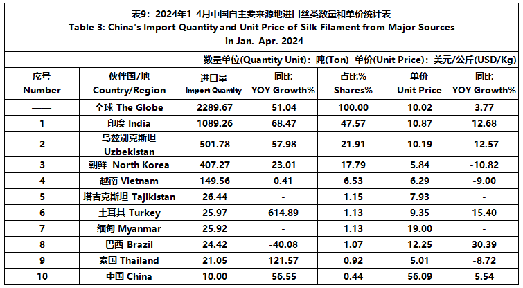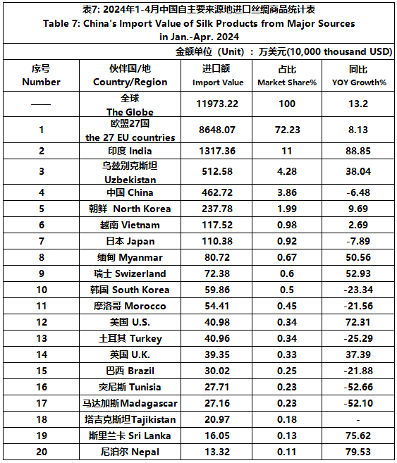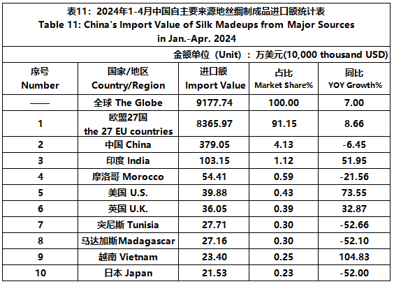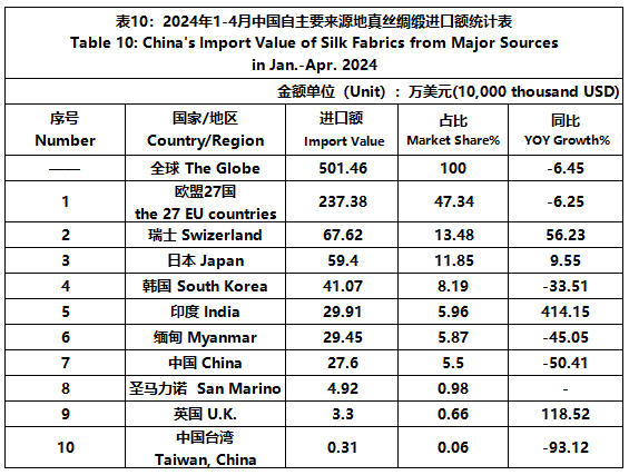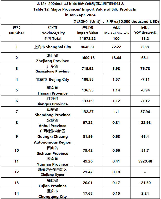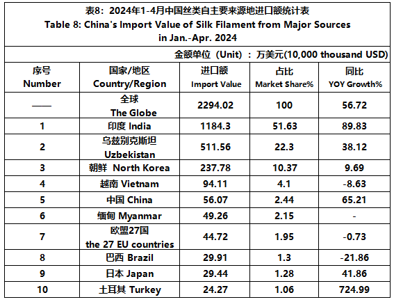 According to GTF, from January to April, the total import and export value of pure silk products was 580 million US dollars, a year-on-year decrease of 3.72%, accounting for 0.57% of China's total textile and apparel imports and exports. Among them, the import value was 120 million US dollars, a year-on-year increase of 13.2%, accounting for 1.68% of China's textile and apparel imports.