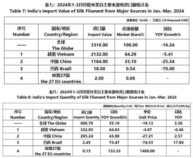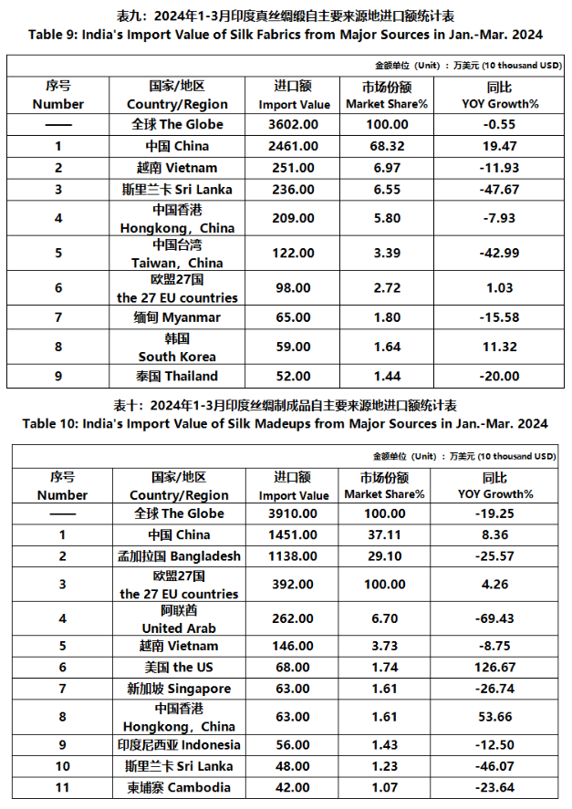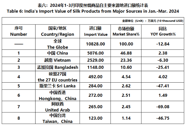 According to statistics from the Ministry of Commerce and Industry of India, from January to March, the foreign trade value of Indian silk products was 1054 million US dollars, a year-on-year increase of 9.33%. Among them, the import value was 108 million US dollars, a year-on-year decrease of 12.84%.