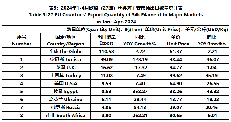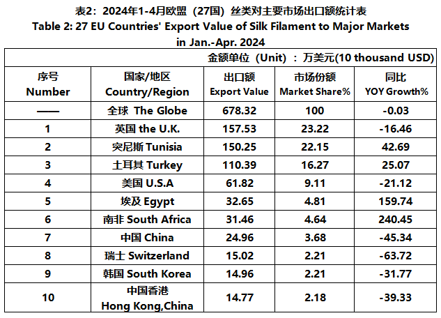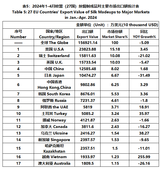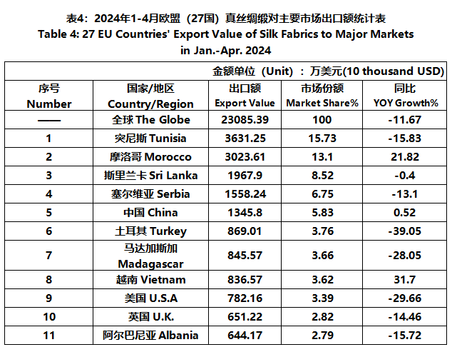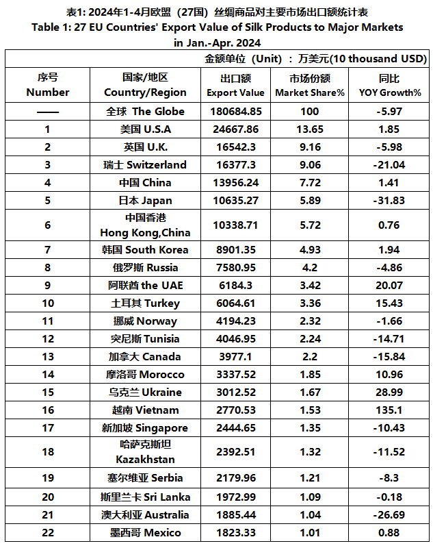 According to Eurostat data, from January to April, the foreign trade value of the EU (27 countries) silk products was 3.999 billion US dollars, a year-on-year decrease of 4.86%. Among them, the export value was 1807 million US dollars, a year-on-year decrease of 5.97%.