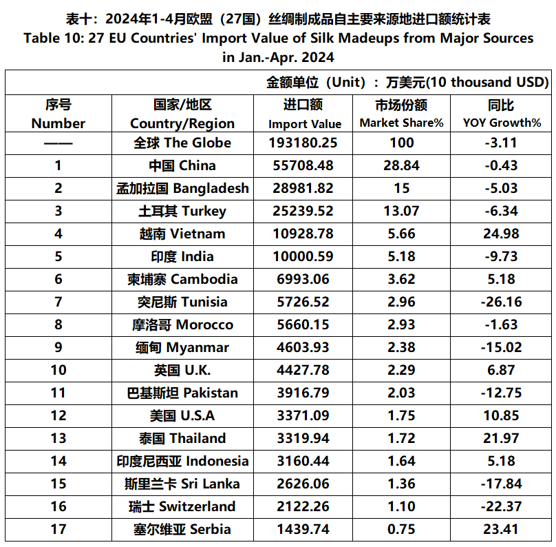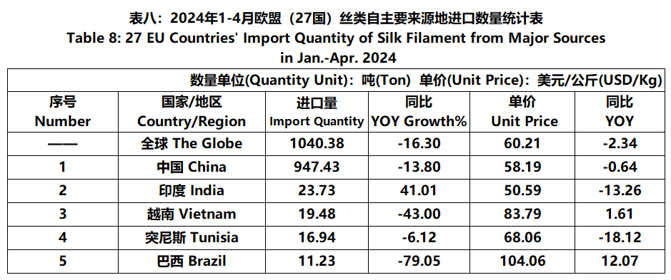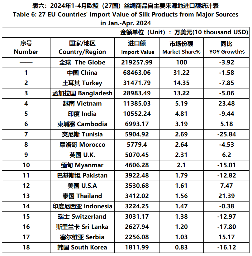 According to Eurostat data, from January to April, the foreign trade value of the EU (27 countries) silk products was 3.999 billion US dollars, a year-on-year decrease of 4.86%. Among them, the import value was 2193 million US dollars, a year-on-year decrease of 3.92%.