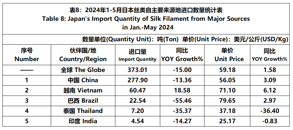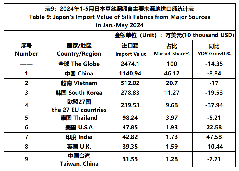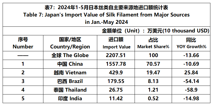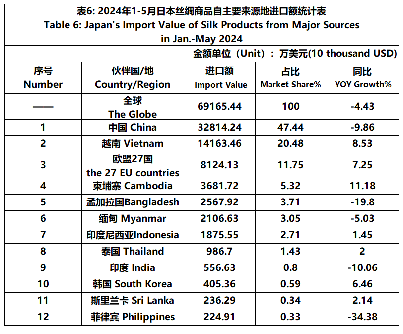 According to JCCI, from January to May, the total foreign trade value of pure silk products was 752 million US dollars, a year-on-year decrease of 5.48%. Among them, the import value was 692 million US dollars, a year-on-year decrease of 4.43%.