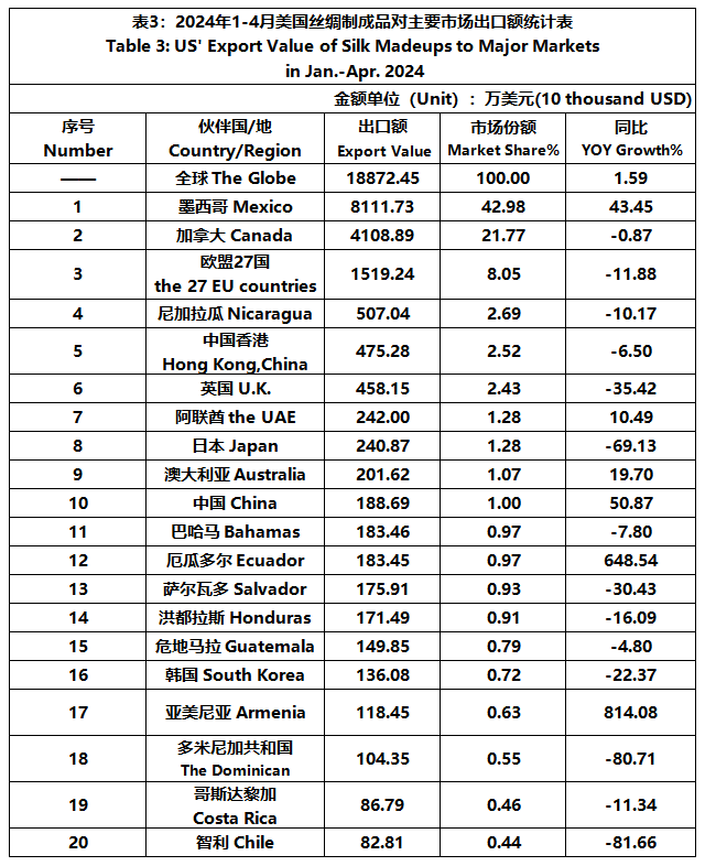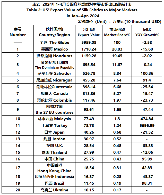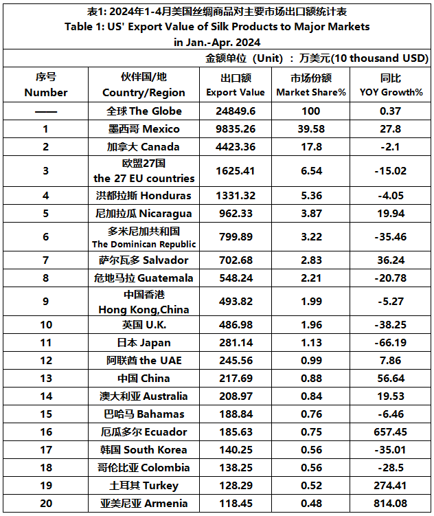 According to the United States Department of Commerce, from January to April 2024, the foreign trade value of U.S. silk products was $2.084 billion, down 4.23% year-on-year. Among them, the export value was 248 million US dollars, a year-on-year increase of 0.37%.