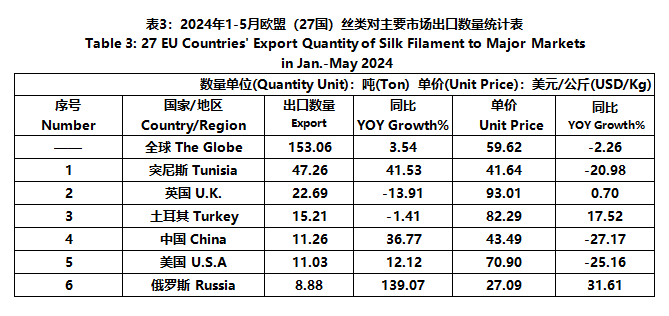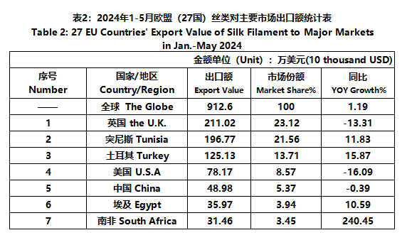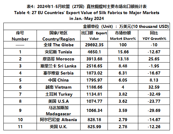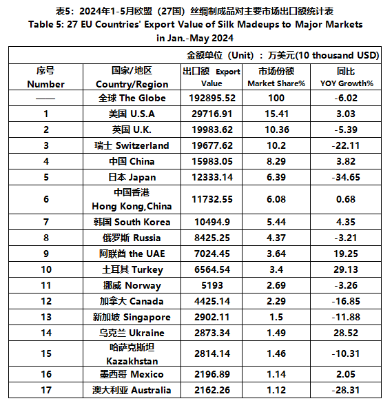 According to Eurostat data, from January to May, the foreign trade value of the EU (27 countries) silk products was 5025 million US dollars, a year-on-year decrease of 4.08%. Among them, the export value was 2235 million US dollars, a year-on-year decrease of 6.54%.