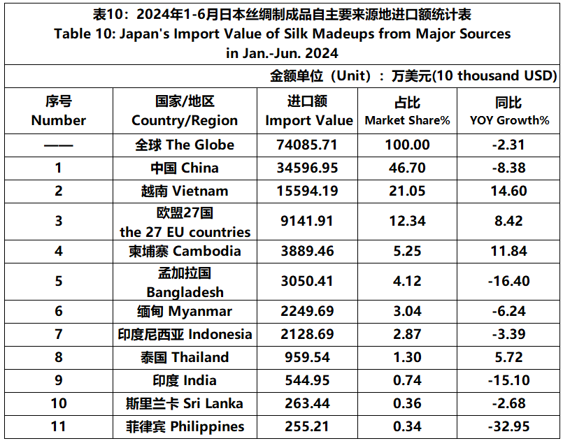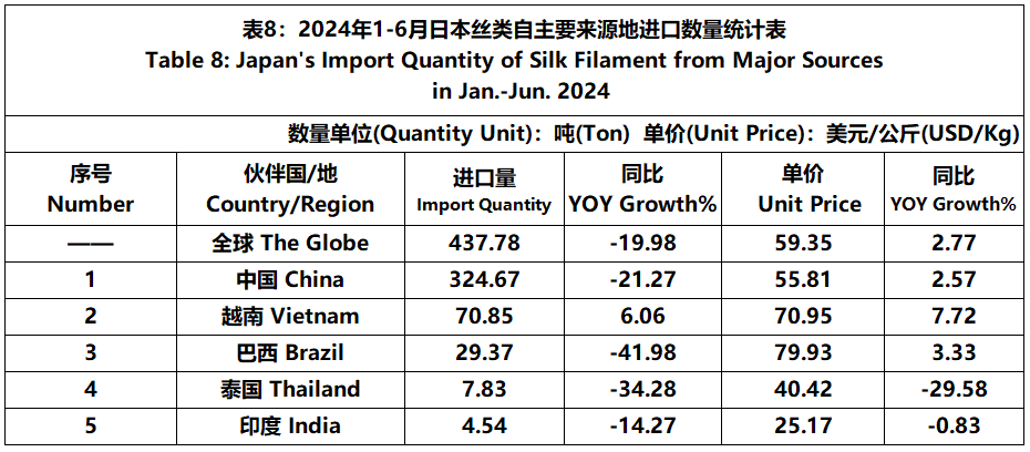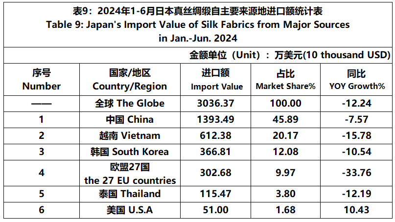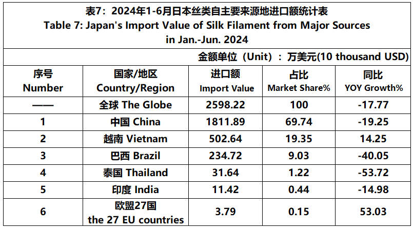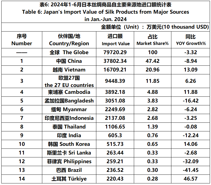 According to JCCI, from January to June, the total foreign trade value of pure silk products was 871 million US dollars, a year-on-year decrease of 4.42%. Among them, the import value was 797 million US dollars, a year-on-year decrease of 3.32%.