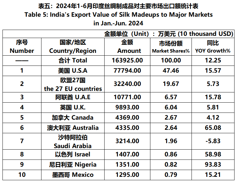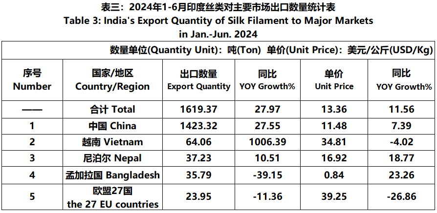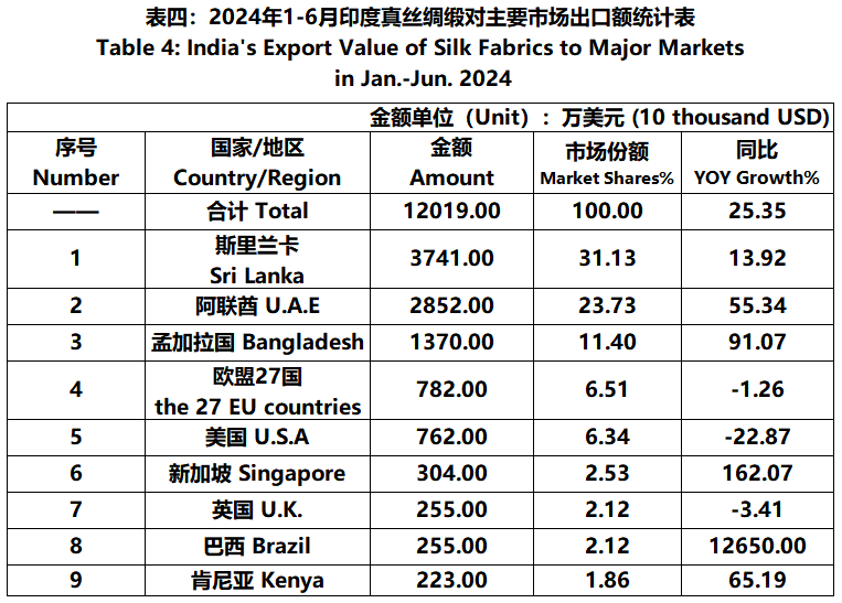 According to statistics from the Ministry of Commerce and Industry of India, from January to June, the foreign trade value of Indian silk products was 1998 million US dollars, a year-on-year increase of 9.60%. Among them, the export value was 1781 million US dollars, a year-on-year increase of 13.34%; The import value was 217 million US dollars, a year-on-year decrease of 13.78%.