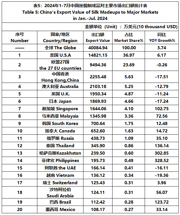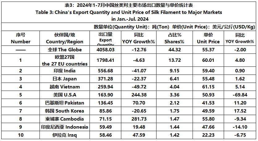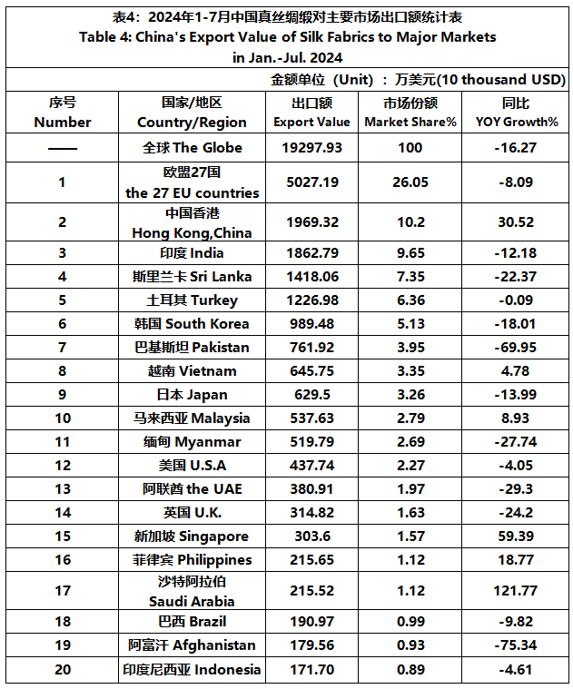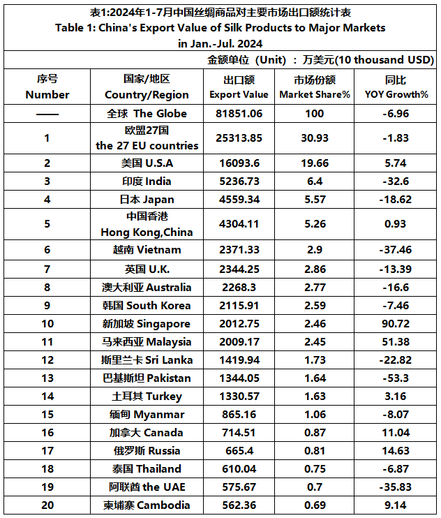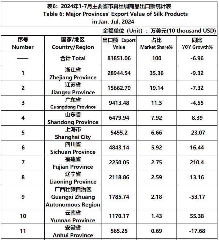 According to GTF statistics, from January to July, the total import and export value of pure silk products was 1022 million US dollars, a year-on-year decrease of 4.39%, accounting for 0.54% of China's total textile and apparel imports and exports. Among them, the export value amounted to 819 million US dollars, experiencing a year-on-year decline of 6.96% and accounting for 0.46% of China's textile and apparel exports.
