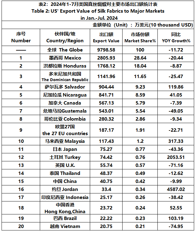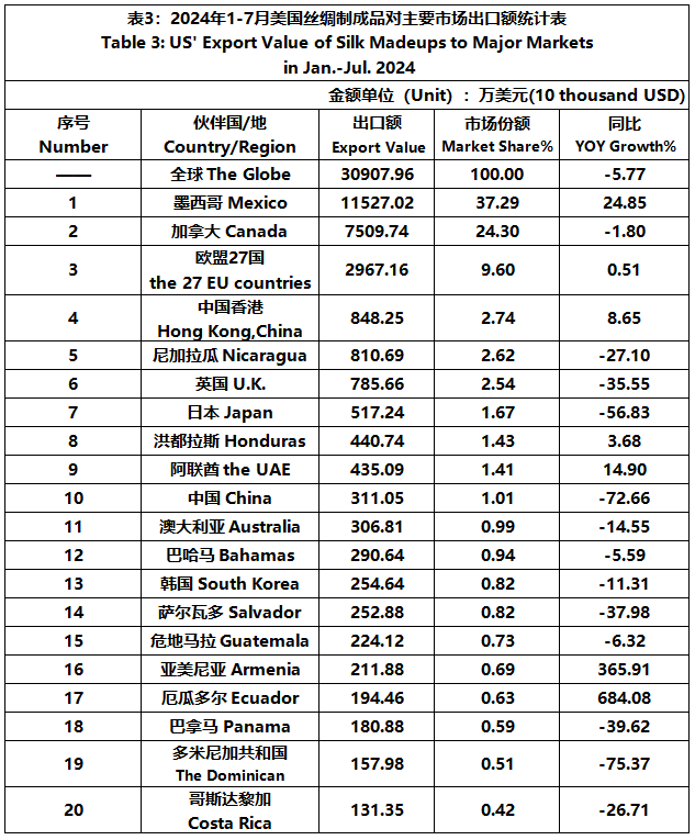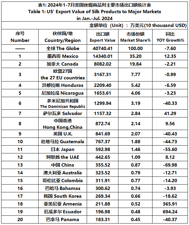 According to the United States Department of Commerce, from January to July 2024, the foreign trade value of U.S. silk products was $3.476 billion, down 1.99% year-on-year. Among them, the export value was 407 million US dollars, a year-on-year decrease of 7.60%; The import value was 3.068 billion US dollars, a year-on-year decrease of 1.19%.