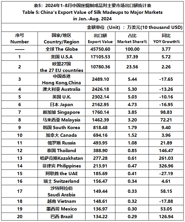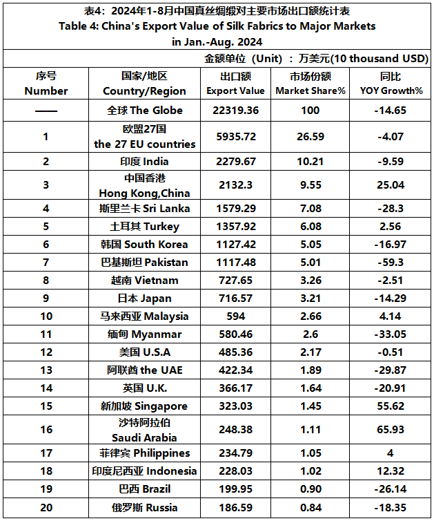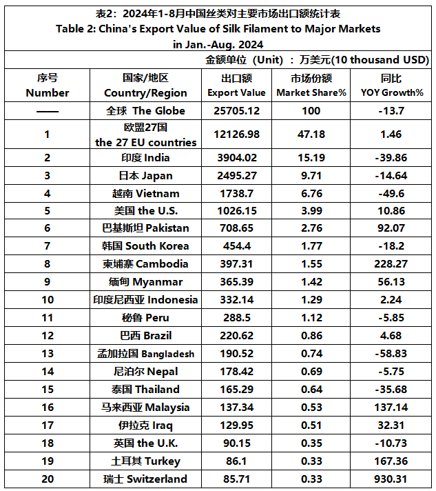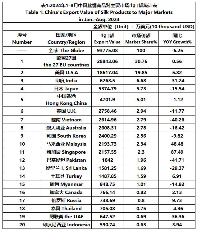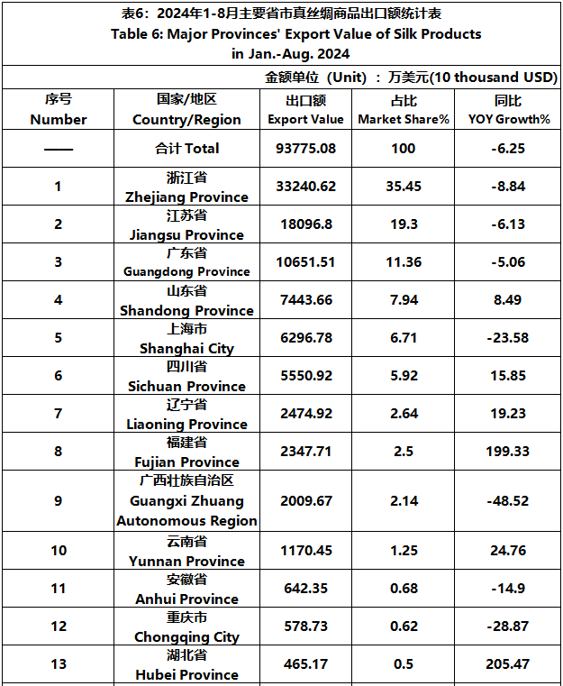 According to GTF statistics, from January to August, the total import and export value of pure silk products was 1163 million US dollars, a year-on-year decrease of 4.49%, accounting for 0.52% of China's total textile and apparel imports and exports. Among them, the export value amounted to 938 million US dollars, experiencing a year-on-year decline of 6.25% and accounting for 0.45% of China's textile and apparel exports.