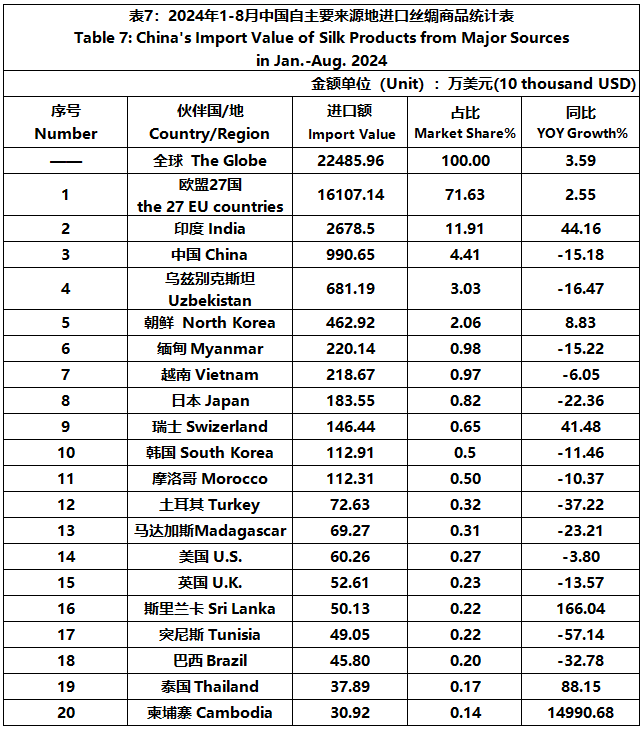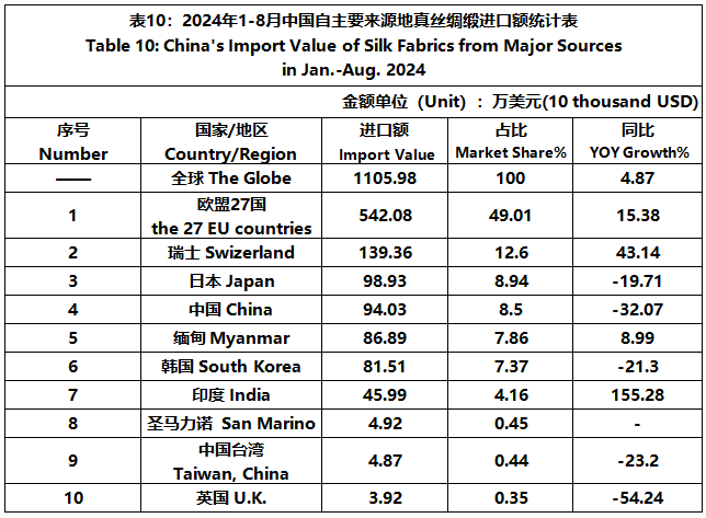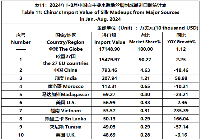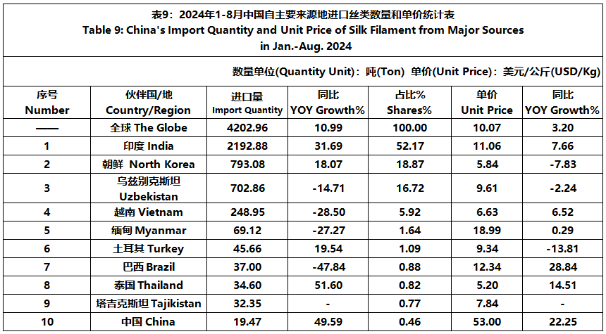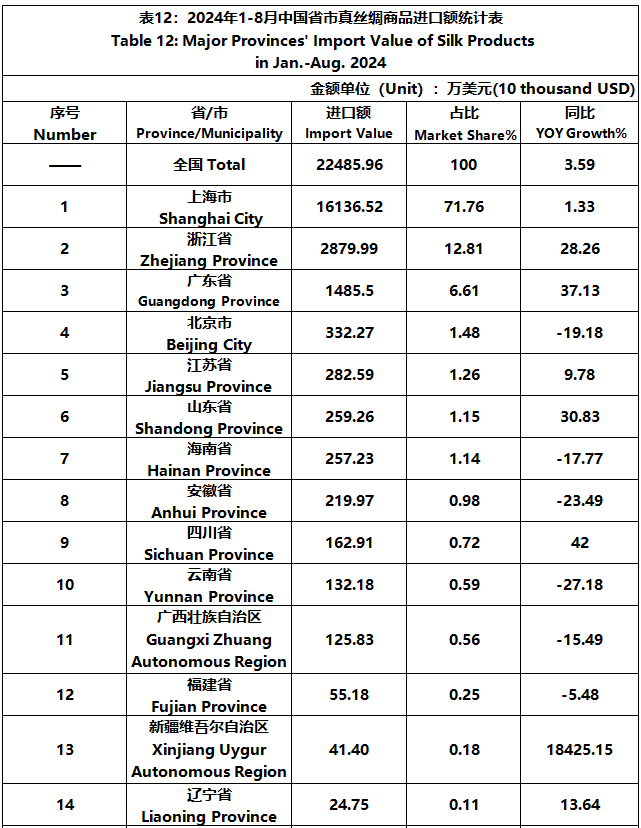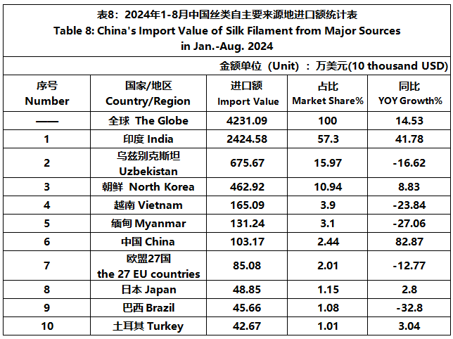 According to GTF statistics, from January to August, the total import and export value of pure silk products was 1163 million US dollars, a year-on-year decrease of 4.49%, accounting for 0.52% of China's total textile and apparel imports and exports. Among them, the import value amounted to 225 million US dollars, experiencing a year-on-year increase of 3.59% and accounting for 1.58% of China's textile and apparel imports.